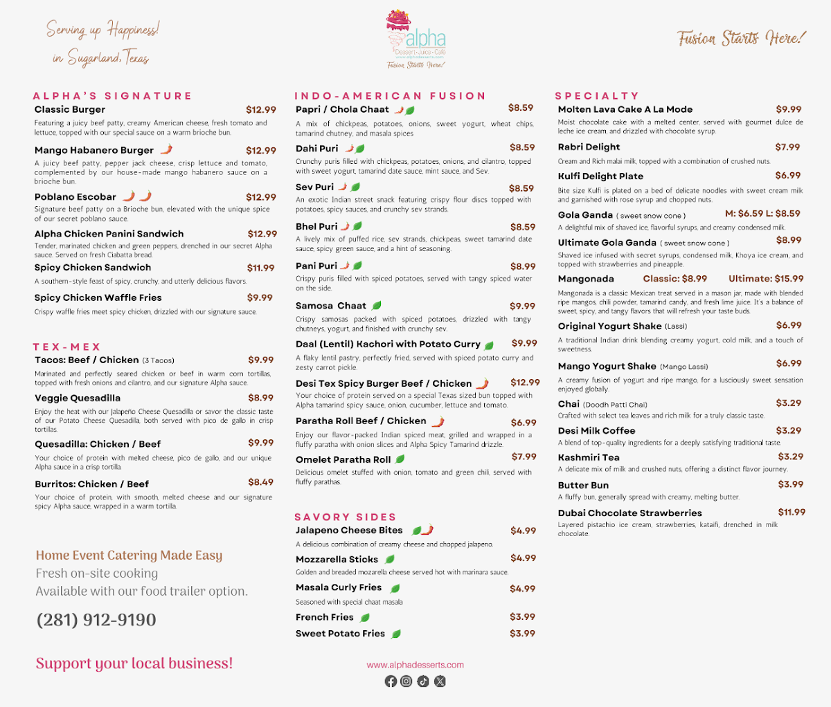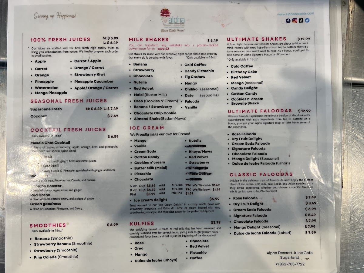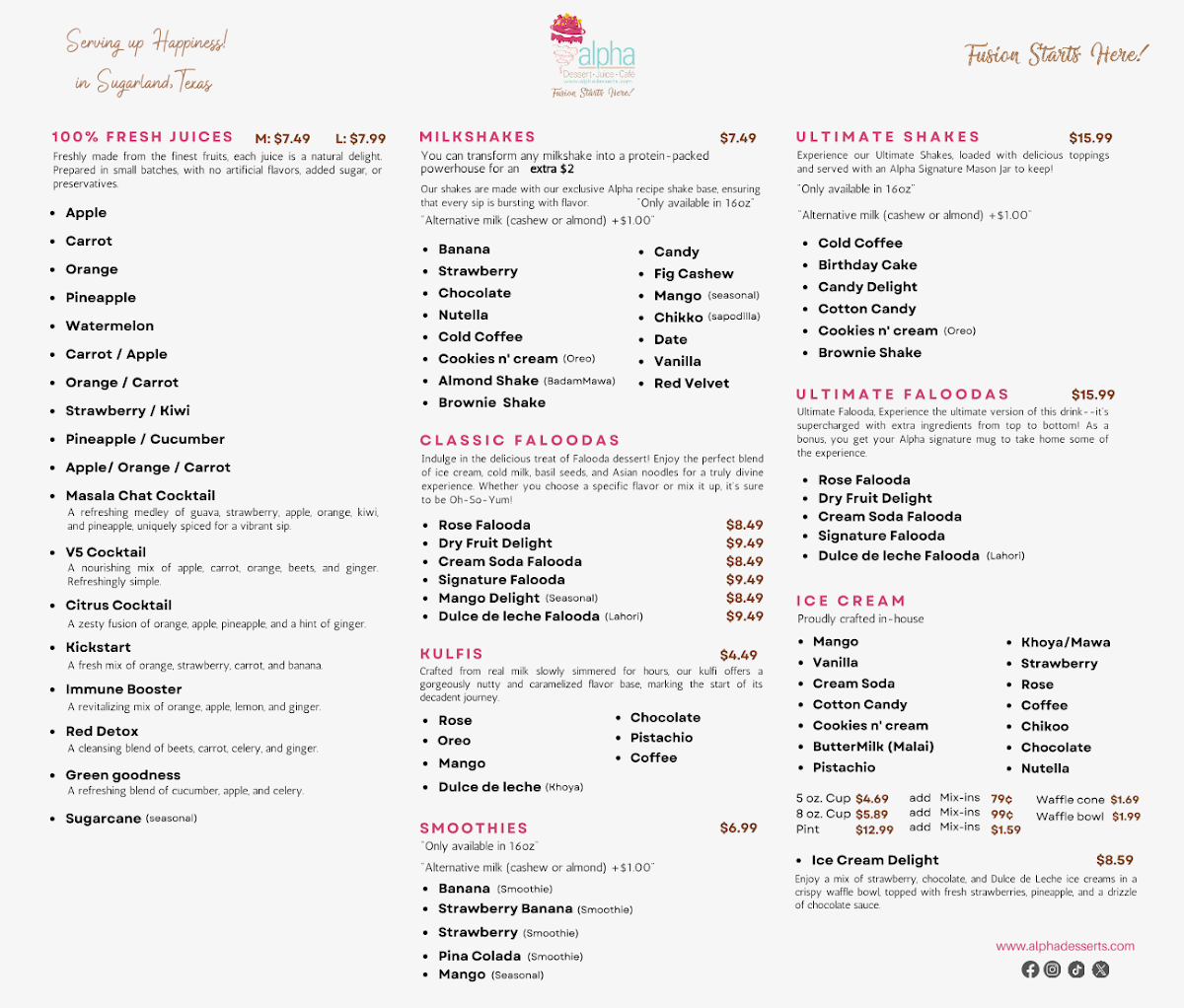 Welcome to Alpha Dessert Juice Cafe Sugarland, a delightful cafe located at 1531 Hwy 6 #140, Sugar Land, TX. Known for its fusion of East Asian and Mexican desserts, this hidden gem offers an eclectic menu that caters to all dessert lovers. Start with their indulgent Birthday Cake Milkshake, combining housemade vanilla and khoya ice creams, topped with macarons and whipped cream—a treat that’s as much a feast for the eyes as it is for the palate.