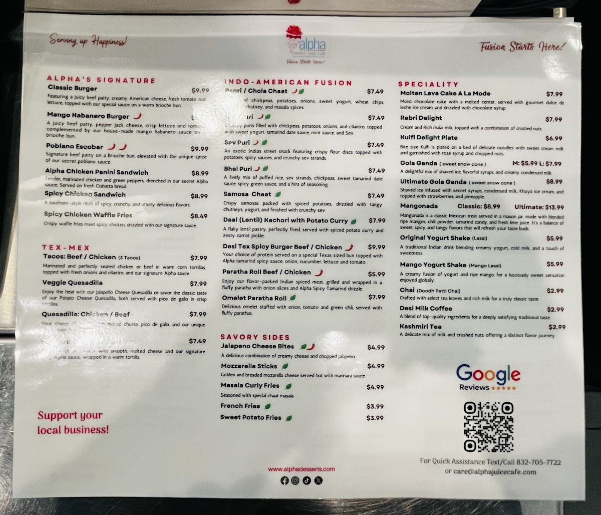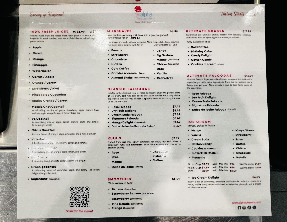 Dive into their rich Dulce De Leche Kulfi, a creamy traditional dessert packed with nutty flavors. For coffee aficionados, the Cortado and Cappuccino promise a robust, flavorful experience. Customers rave about the freshness of the food and the warm, welcoming atmosphere, making it an ideal spot for family and friends alike. Don’t miss their renowned faloodas and unique juicing options. With free parking and indoor seating, Alpha Dessert Juice Cafe is truly a dessert destination worth exploring!